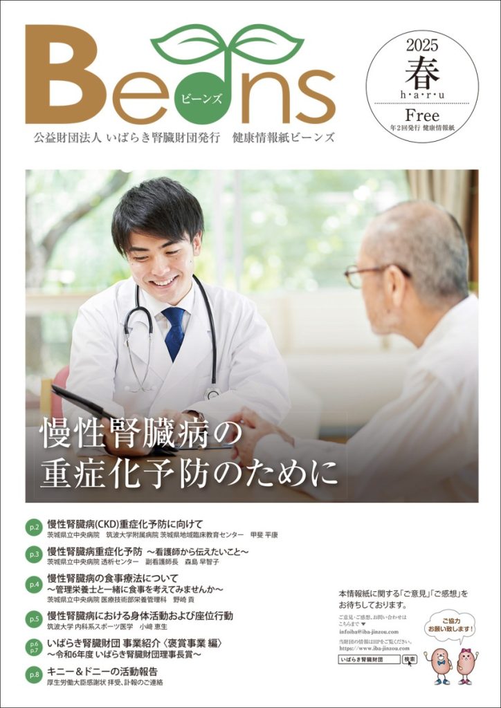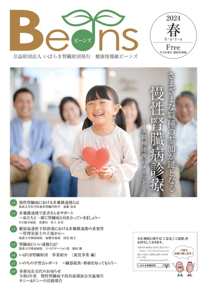 慢性腎臓病における多職種連携とは/多職種連携で患者さんをサポート/糖尿病透析予防指導における多職種連携の重要性/腎臓病にいい運動とは?/いばらき腎臓財団 事業紹介〈褒賞事業 編〉/いのちの学習会レポート/事務局長交代のお知らせ/令和5年度 慢性腎臓病予防出前講演会実施報告/キニー&ドニーの活動報告 -