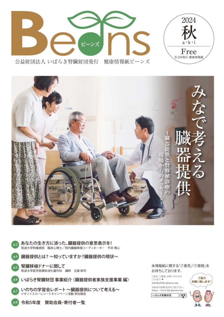 あなたの生き方に添った、臓器提供の意思表示を!/臓器提供とは?~知っていますか?臓器提供の現状~/腎臓移植ドナーに関して/いばらき腎臓財団 事業紹介〈臓器提供者家族支援事業 編〉/いのちの学習会レポート~臓器提供について考える~/令和5年度 賛助会員・寄付者一覧 -